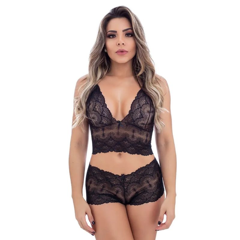 Extremamente sensual, esse conjunto é confeccionado totalmente em renda, possuindo detalhes em formato leque em suas bordas. Desenha perfeitamente o seu corpo, realçando os seus pontos mais sexys. Possui alças reguláveis e um lindo lacinho no centro.