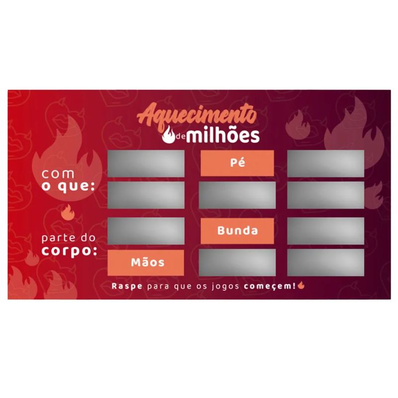 Está sem ideias? Quer inovar e fazer algo novo na relação? A Raspadinha das Preliminares é ideal para te ajudar. Faça brincadeiras, deixe que a sorte decida por você o que fazer e onde. Viva essa experiência.